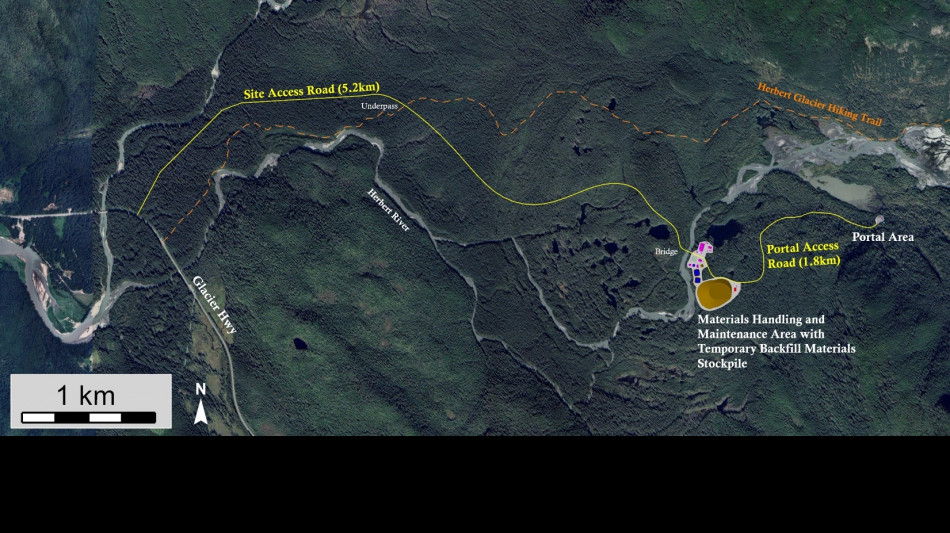 The project site will be accessed via a new 5.2km access road connecting to Glacier Highway, a paved public highway connecting to the city of Juneau. No personnel housing camp facilities are planned, rather the workforce will be transported by crew bus from Juneau for each shift as the site will be only an approximately 35-minute drive from the Juneau suburbs. The city of Juneau serves as a regional mining hub currently supporting two major underground mines, with a skilled local mining workforce and equipment maintenance facilities.