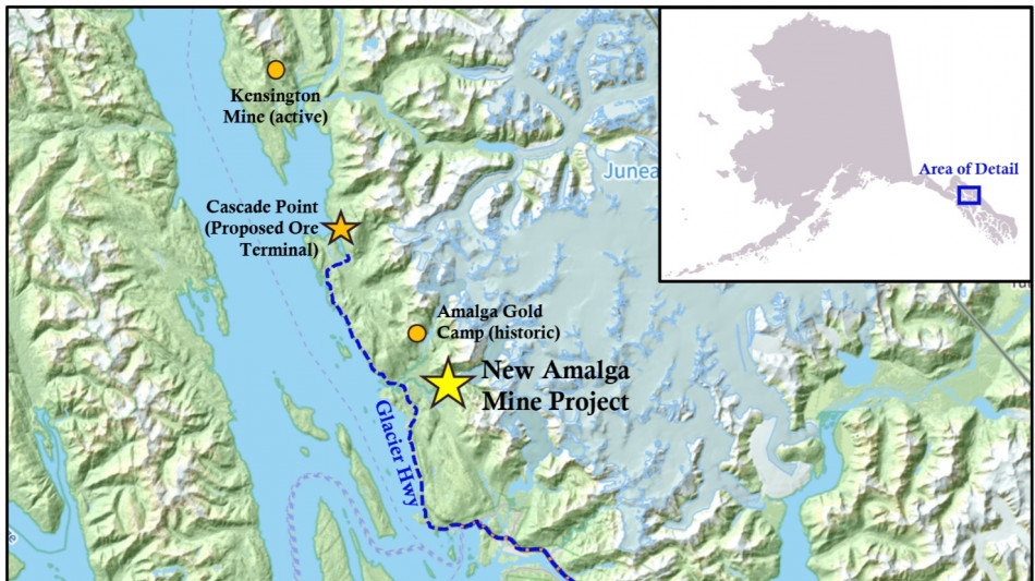The New Amalga Gold Project is located only 25km from Alaska's capital city of Juneau and 6km from paved highway. The resource remains open to expansion in multiple directions and hosts an Indicated Resource of 1,438,500 ounces of gold at an average grade of 9.47 g/t Au (4,726,000 tonnes) and an Inferred Resource of 515,700 ounces of gold at an average grade of 8.85 g/t Au (1,813,000 tonnes).